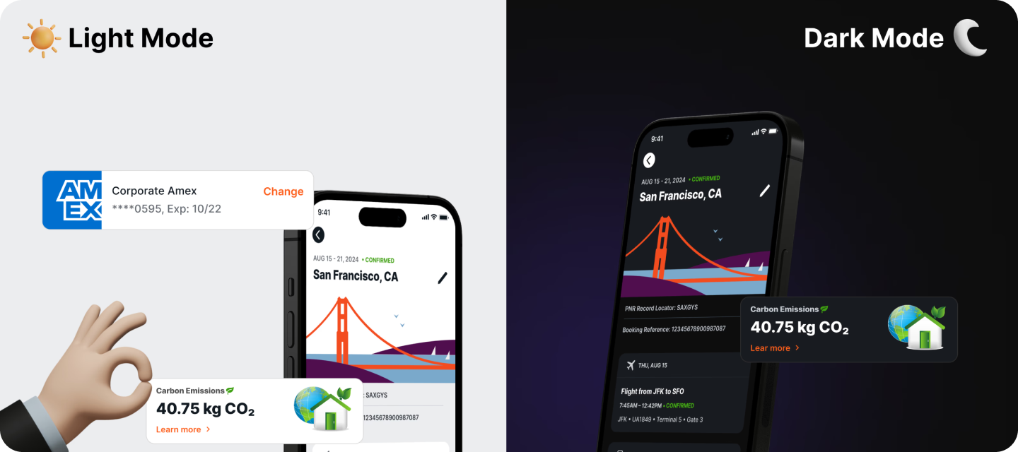 The challenge wasn't just visual polish. Enterprise travel is operationally complex: multi-leg itineraries, corporate policy enforcement, approval chains, expense integration, and support for travelers with specific accessibility needs. Every screen needed to handle real-world edge cases that consumer travel apps never encounter.