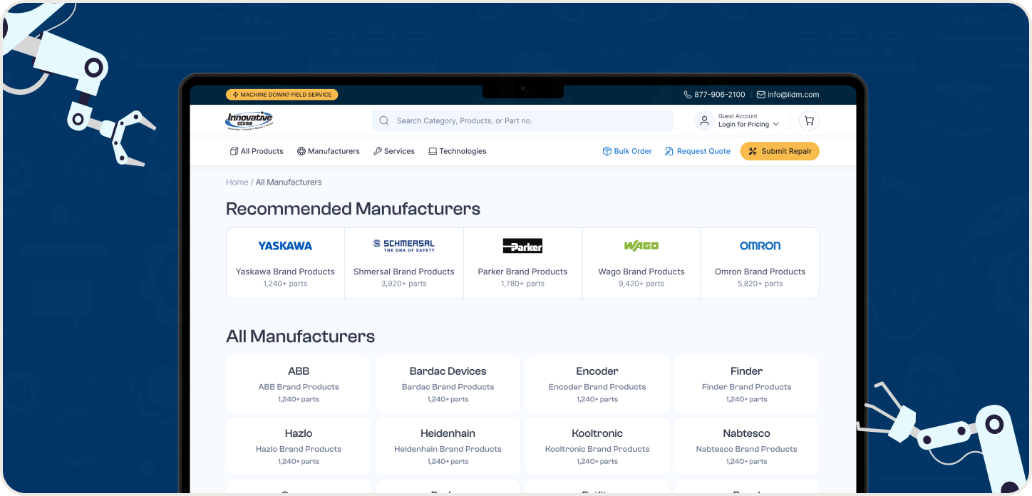 IIDM's potential customers lacked awareness of the full range of products and services available. The existing system made it difficult to browse 10 million products across 10 manufacturers. Accessing repair services was unclear and frustrating. The company needed a single platform that could serve as both a marketing hub and a fully functional B2B procurement system.