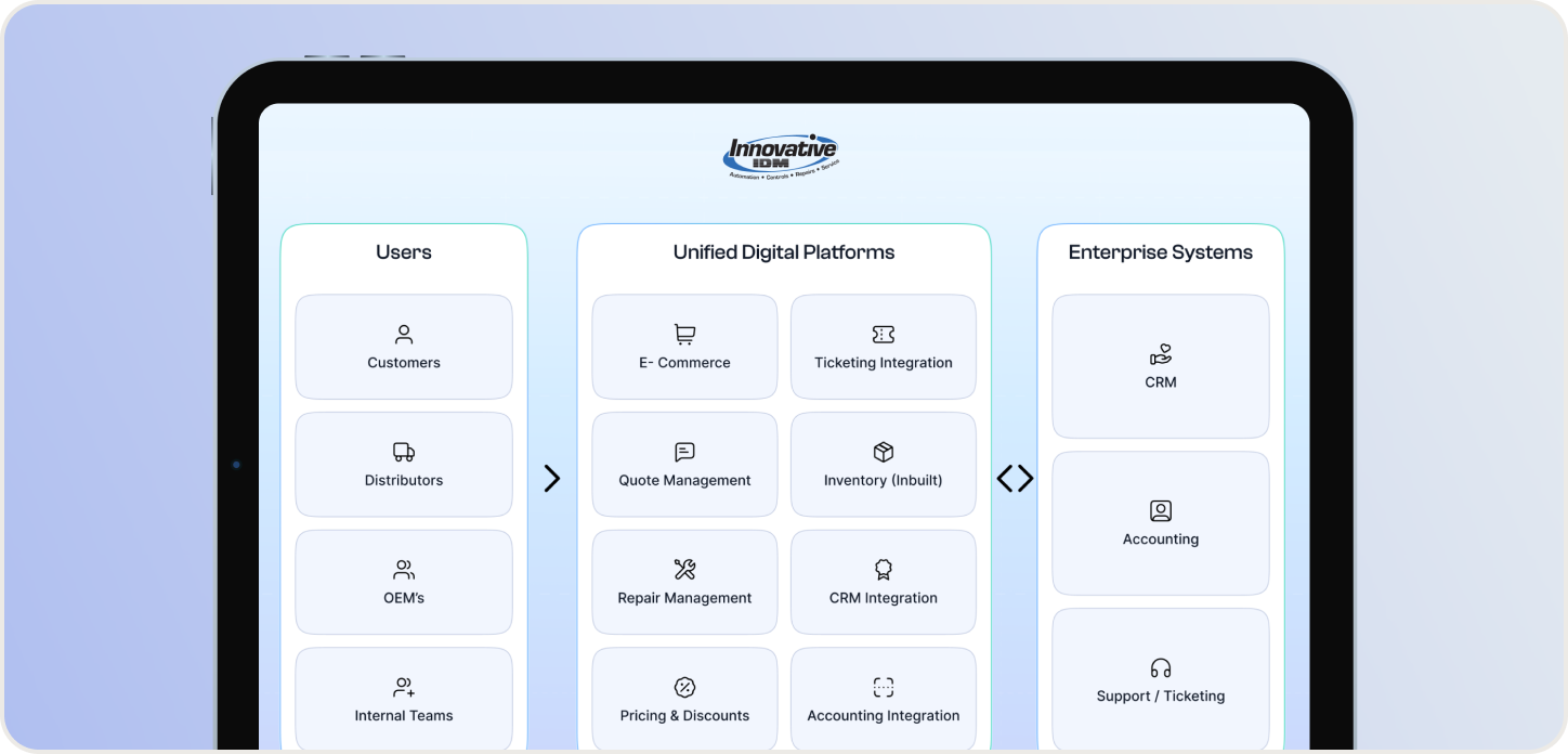 Innovative IDM needed a unified B2B platform that could handle 10 million industrial automation products from 10 manufacturers across 100 categories. We built the storefront, the ERP, the customer portal, and the mobile PWA.
